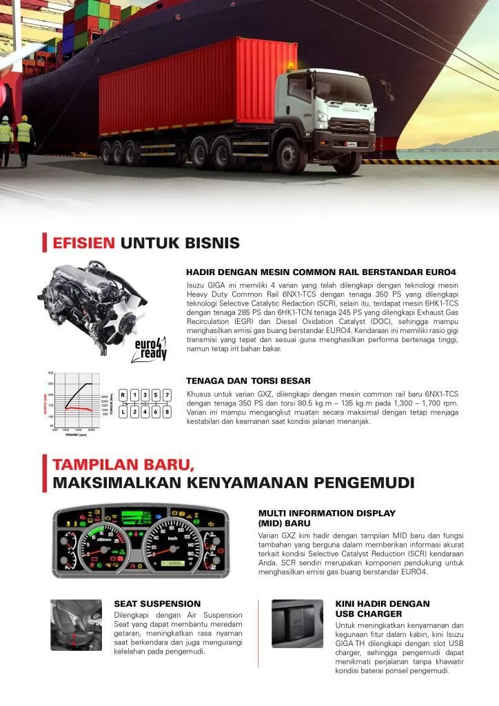 Isuzu Giga Traktor Head, Efisien untuk Bisnis. dengan maksimum tenaga sampai dengan 350 PS dan 135 Kgm torsi, siap menghadapi setiap tantangan dengan angkutan muatan yang berat.