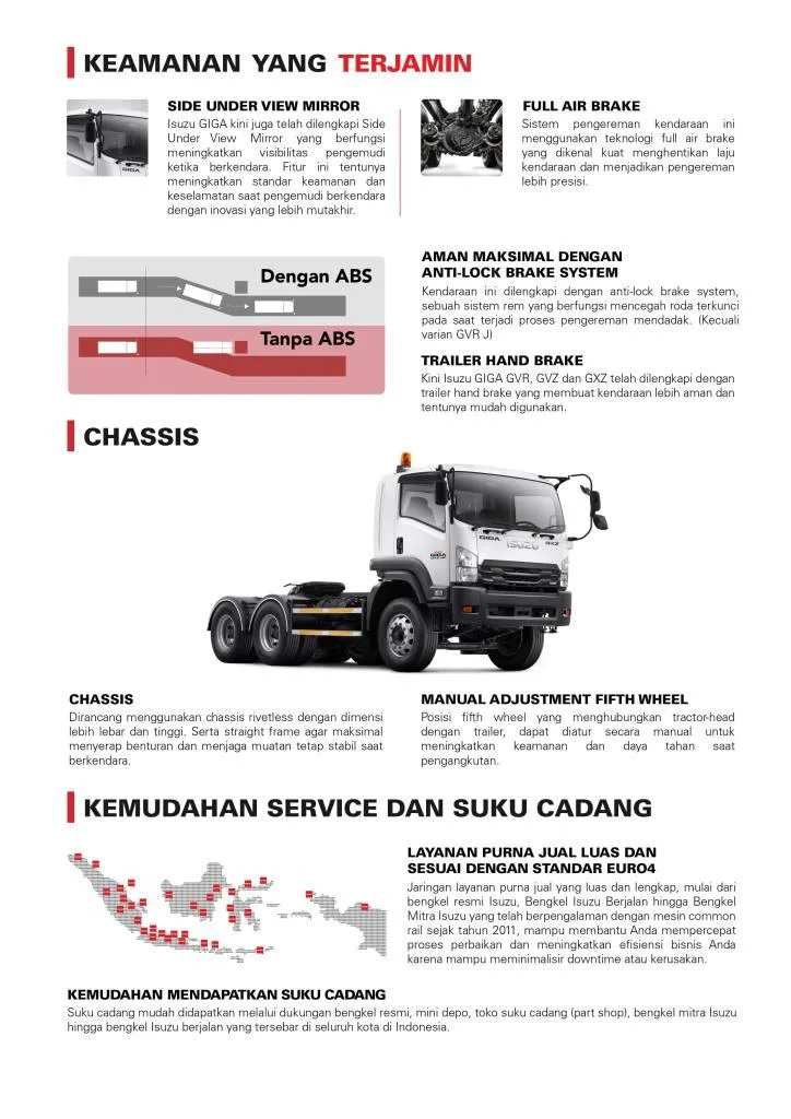 Oleh karena itu dibutuhkan truk yang dapat diandalkan untuk bisa menaklukkan tantangan tersebut. Isuzu Giga Traktor head hadir dalam dua macam penggerak yaitu untuk penggerak 4×2 ada Isuzu Giga FVR TH dengan tenaga 245 PS dan Isuzu Giga GVR dengan tenaga 285 PS. Serta untuk penggerak 6×4 hadir Isuzu Giga GVZ dengan tenaga 285 PS dan Isuzu Giga GXZ dengan tenaga 345 PS.
